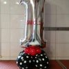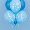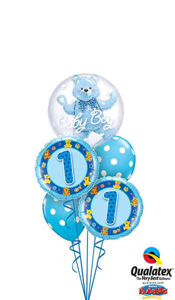 Ciuffo con bouble boubble con orsetto , 2 palloni tondo con N1 e 2 palloni in lattice , sia celeste che rosa.
