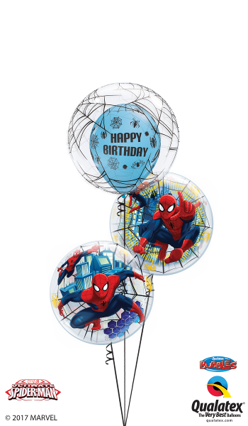 Bouquet tema spiderman con 1 double boubble con ragnatele , e 2 boubble spiderman e peso in colore del ciuffo. Versioni variabili SPIDEMAN , PRINCIPESSE , FROSEN , TOPOLINO , MINNI , JACK E I PIRATI , WINNY POOH , NINJA TURTLE , MANNY AGGIUSTA TUTTO , MOANA , CARS , LA GUARDIA DEL LEONE , DOTTORESSA PHELUCHE.